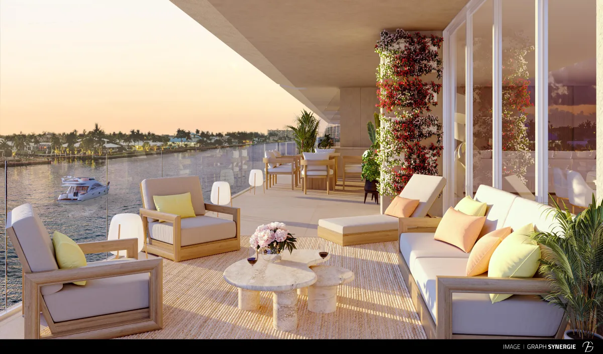 Residences: Each unit boasts direct intracoastal water views and private elevator access opening directly into the residence. Expansive terraces of over 500 square feet provide ample outdoor living space.